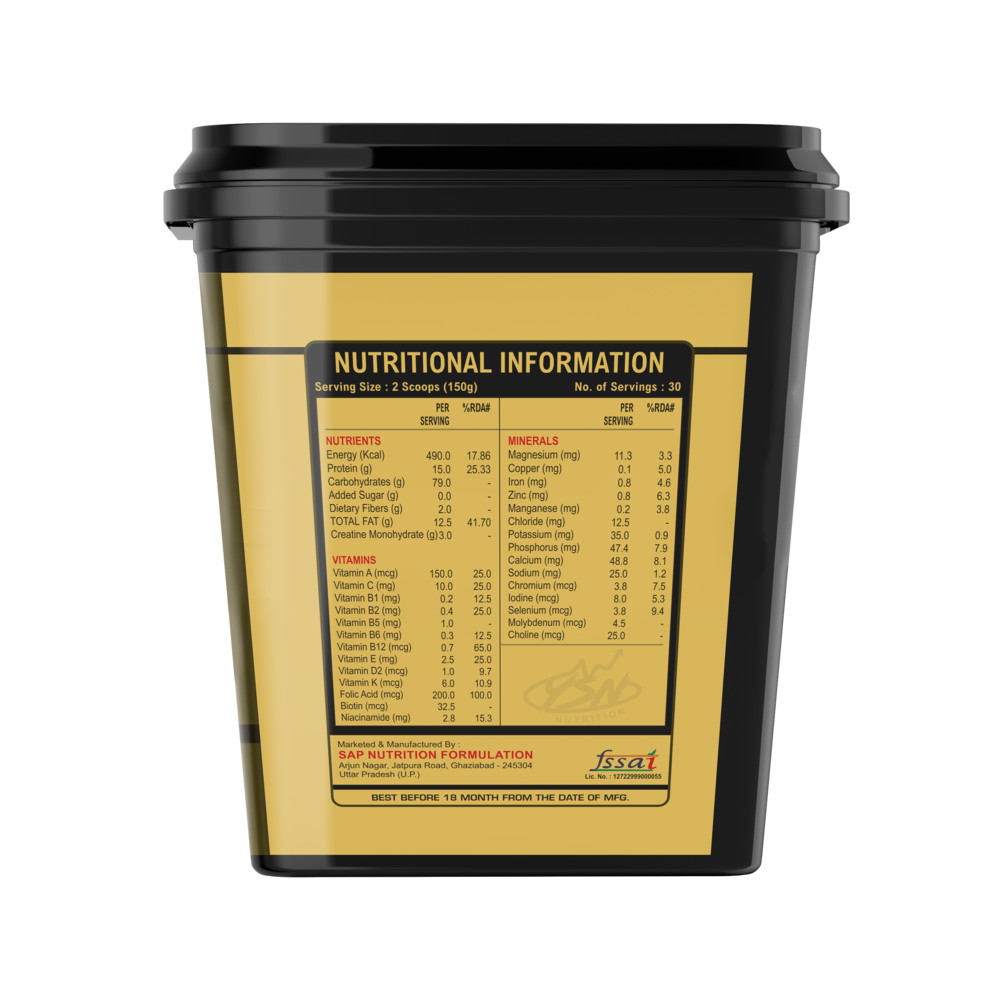 Each serving of Jumbo Power delivers a rich blend of proteins that help repair and build lean muscle tissue after intense workouts. The fast and slow-digesting carbohydrates provide sustained energy to fuel your training sessions and help replenish glycogen levels in the muscles. It also contains essential vitamins and minerals that support overall health, metabolism, and performance.