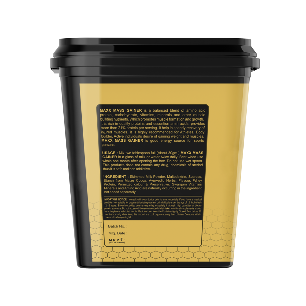 Maxx Mass Gainer is easy to mix and has a delicious taste, making it convenient to consume anytime during the day. Whether you are a beginner trying to gain weight or an athlete looking to increase muscle size, this mass gainer helps you meet your calorie and protein requirements effectively. Maxx Mass Gainer to your daily routine to support healthy weight gain, muscle recovery, and improved workout performance. It is the perfect choice for those who want to bulk up and achieve their fitness goals faster.