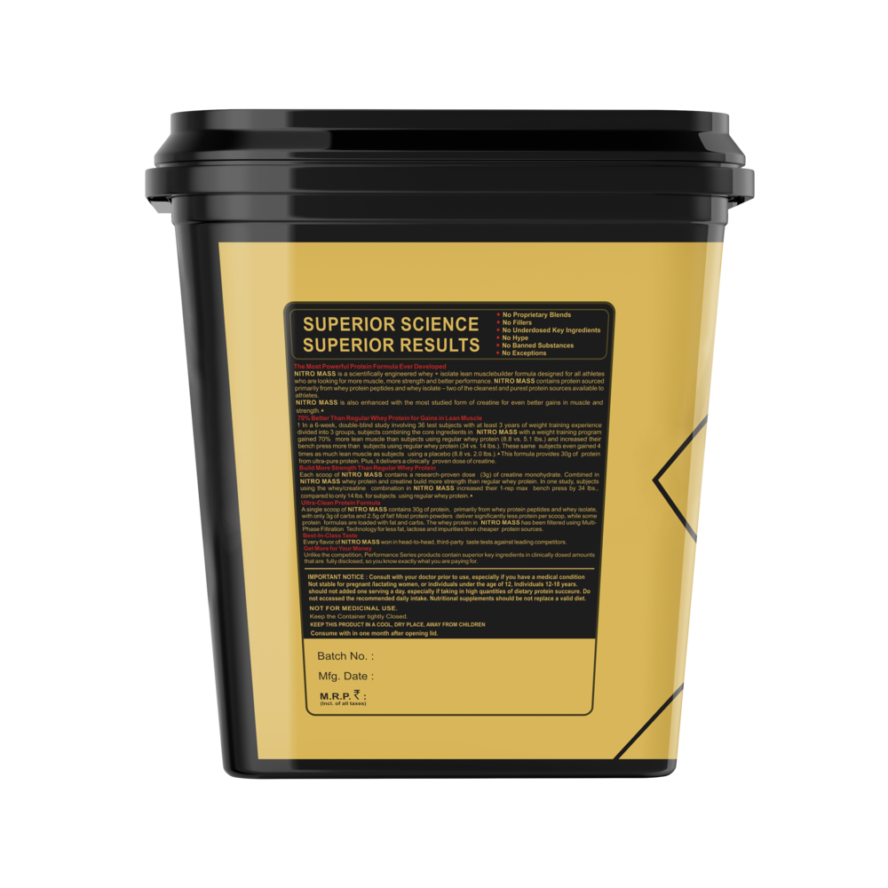 Nitro Mass is easy to mix and has a delicious taste, making it convenient to consume anytime during the day. Whether you are a beginner trying to gain weight or an athlete looking to increase muscle size, this mass gainer helps you meet your calorie and protein requirements effectively. Nitro Mass to your daily routine to support healthy weight gain, muscle recovery, and improved workout performance. It is the perfect choice for those who want to bulk up and achieve their fitness goals faster.