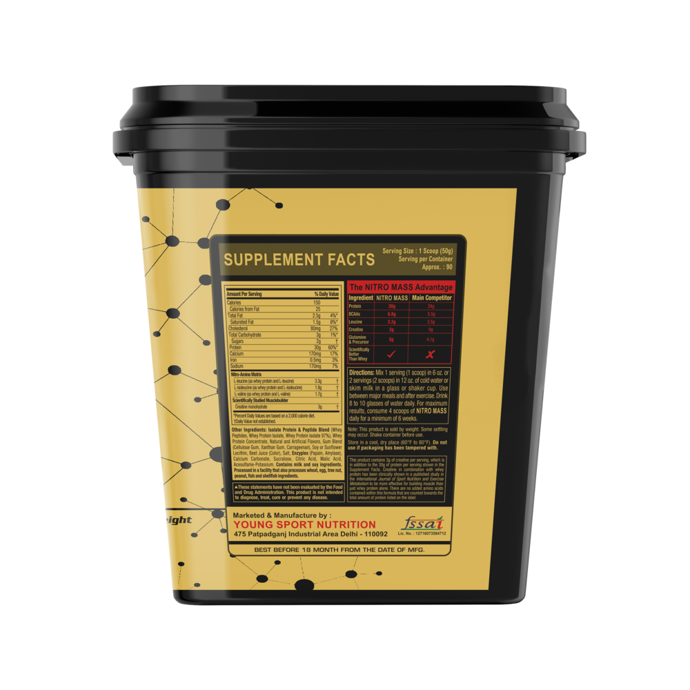 Nitro Mass is a powerful high-calorie formula specially designed for individuals who struggle to gain weight and build muscle mass. This advanced mass gainer provides the perfect combination of high-quality protein, complex carbohydrates, and essential nutrients to support muscle growth, strength, and recovery. It is an ideal supplement for bodybuilders, athletes, and fitness enthusiasts who want to increase their daily calorie intake and achieve a bigger, stronger physique.